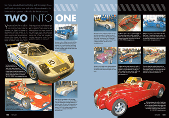 FEATURES A HARD ACT TO FOLLOW 36 RAC man Tony Medri’s Dax Rush is a masterclass in car construction but the real gem is under the bonnet. Can an Essex V6 rival modern motors? THE KIT CAR GUIDE 50 Back by popular demand from those seeking to discover who makes what is the Kit Car Guide. Over the next six months, we’ll bring you the whole lot. An enormous amount of work is going into this guide. In this issue we've covered approximately 20 models from the Absolute Performance C350 to the Boom Trike. Next month we'll be covering BRA to wherever the alphabetical sequence leads. SPECIAL EFFECTS 68 Adam James visits Auto Effects where all is not quite what it seems. CROUCHING TIGER 74 The unsung, under-stated Tiger Avon packs a mighty punch and is cheap to build. Adam James drove the demonstrator and was smitten. HANDS ACROSS THE SEA 87 For replica manufacturers, the Daytona is a natural progression from the legendary Cobra. BA Daytona is making them available at a reasonable price. TWO INTO ONE 100 Ian Hyne did the rounds at both Detling and Stoneleigh and found plenty to impress and delight. The kit car industry is very much alive and well. WORKSHOP MOTO LITA COMPETITION 47 Moto Lita steering wheels are world renowned for style and quality and we have one to give away. It comes with the mounting kit and a polished boss and you take your pick of leather or wood rim. It’s worth around £230. GOING ROUND THE